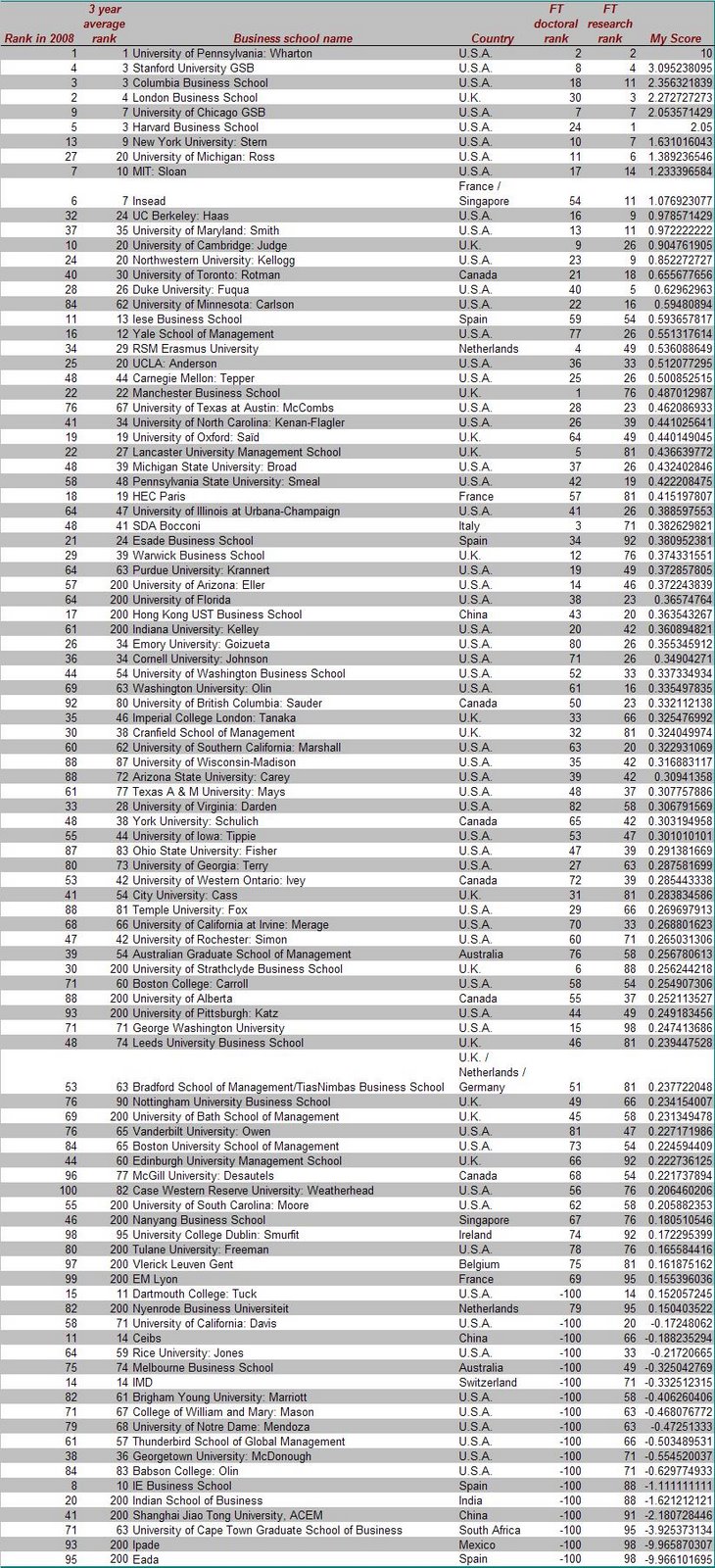 I realise I haven’t responded to several comments on a few posts prior to this one, but I couldn’t help post this before I lose my luck and/or connection. I was and am so bored that I decided to play around with the ranking of MBAs around the world as created by FT (http://www.ft.com/) and then re-align them according to my interest. Nothing rocket science in here, but just glad to find out that it seems to reflect a decent ranking of the PhD programmes in management. Note that every column except the last is provided by FT but the basis for the values under Doctoral ranking and Research ranking are not useful per se. Doctoral ranking is based on the number of PhDs given out per year with some additional points given if the graduates join any of the top 50 institutes as faculty. I could have a thousand doctoral students coming out but that might be of no use if they are not good enough. I might have only 2 coming out and that doesn’t mean that I am of the highest standard. Research ranking is based on the number of noteworthy publications. I might write a thousand research papers but that score is being attributed to the university where I work though it might be based on the dissertation I did while at another university or it could be done in collaboration with another prof from another univ (in which case both univs get a score). So I decided to jumble up numbers a bit and see how things might look if I gave a sizeable weight to the research ranking, an average weight to the 3 year ranking and then a marginal weight to the Doctoral ranking. If a univ has no doctoral program then it doesn’t count and hence its Doctoral rank is -0.01. If a univ has never been ranked before then it needs to be looked at cautiously and hence, its 3 year rank is -0.1. So here are the scores: