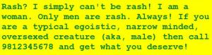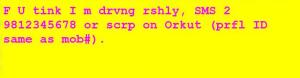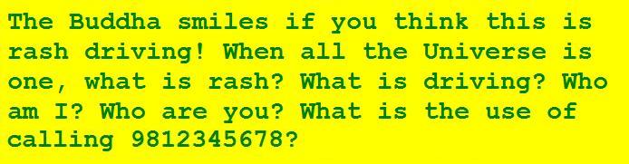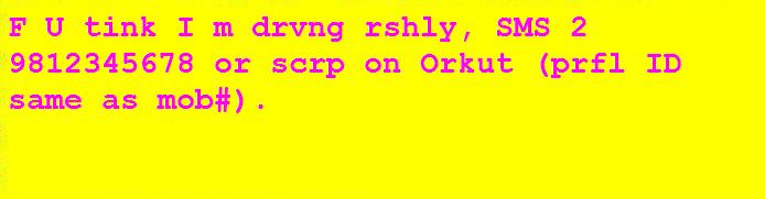 Bangalore is a city where private vehicles carry a benevolent sign on their rear (wherever there is space). This sign asks the reader to call a particular number if the vehicle bearing that sign is found to be driving rashly. A typical message is:
