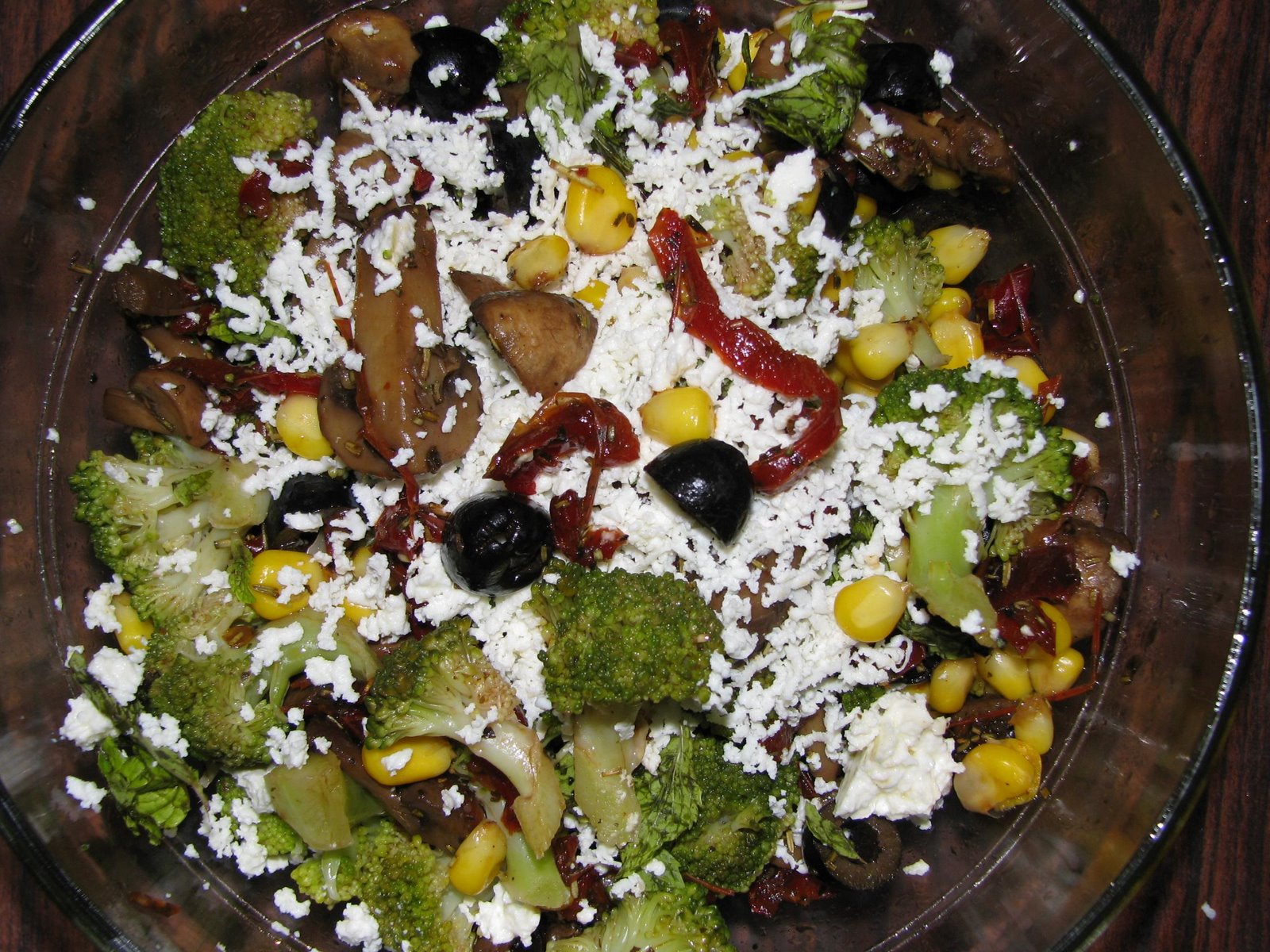Rainbow meals!This is the best way to get in as much colour into a healthy diet. Made with sauteed mushrooms, red bell peppers (capsicum), steamed corn and broccoli, kalamata olives, basil, rosemary, mint and grated paneer (cottage cheese) in a balsamic vinegar and lime juice vinaigrette. So we have black, white, green, yellow, browns and reds!! Ta-da!
