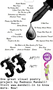 Since it does seem to be happening, I will post details about it. Recently, Madness Mandali decided to organise a visual poetry project. 33 poets were chosen from around 150 and the artists were assigned to each poet. The artists and poets worked closely to come up with a poem-art combination. I would love to post the final piece my artist developed for my poem which was chosen but I will have to wait for a green signal from Madness Mandali. It seems that the book might be available for ordering sometime next week. Let’s wait and see.