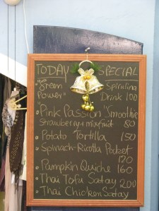 When we reached Villa Blanche, I was delighted to find it nearly match the picture I had in mind. Warm sunlit roads led up to this blue-and-white house. The house opposite it is also nice though (as I recall) it was in red. It wasn’t noisy. There were a few bikes parked outside and I heard a tingling laughter come from behind the leafy barricade of the bistro. There is a quality of laughter that not everyone possesses – the ability to infect another with a smile. The mere sound of it, a distant view of it, and the observer helplessly smiles. Not all laughter is of the soul. We walked in, bowing through the arches of wild plants, and landed right in the midst of the cheerful Villa Blanche with Yogini smiling looking pretty in her spaghetti blouse and short skirt. She clearly carried the cheer of the place. She asked us where we were from and when we told her how we had heard about her place she was proudly disappointed to know that people all over India were familiar with her place. She gave me the picture that she would have preferred to be less popular but also acknowledged the renown her place was earning. I had come to taste the creation at this place to figure out whether it was just tall talk or the place really had something to offer. I must say it was well worth all the praise it had received.