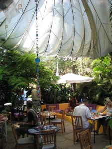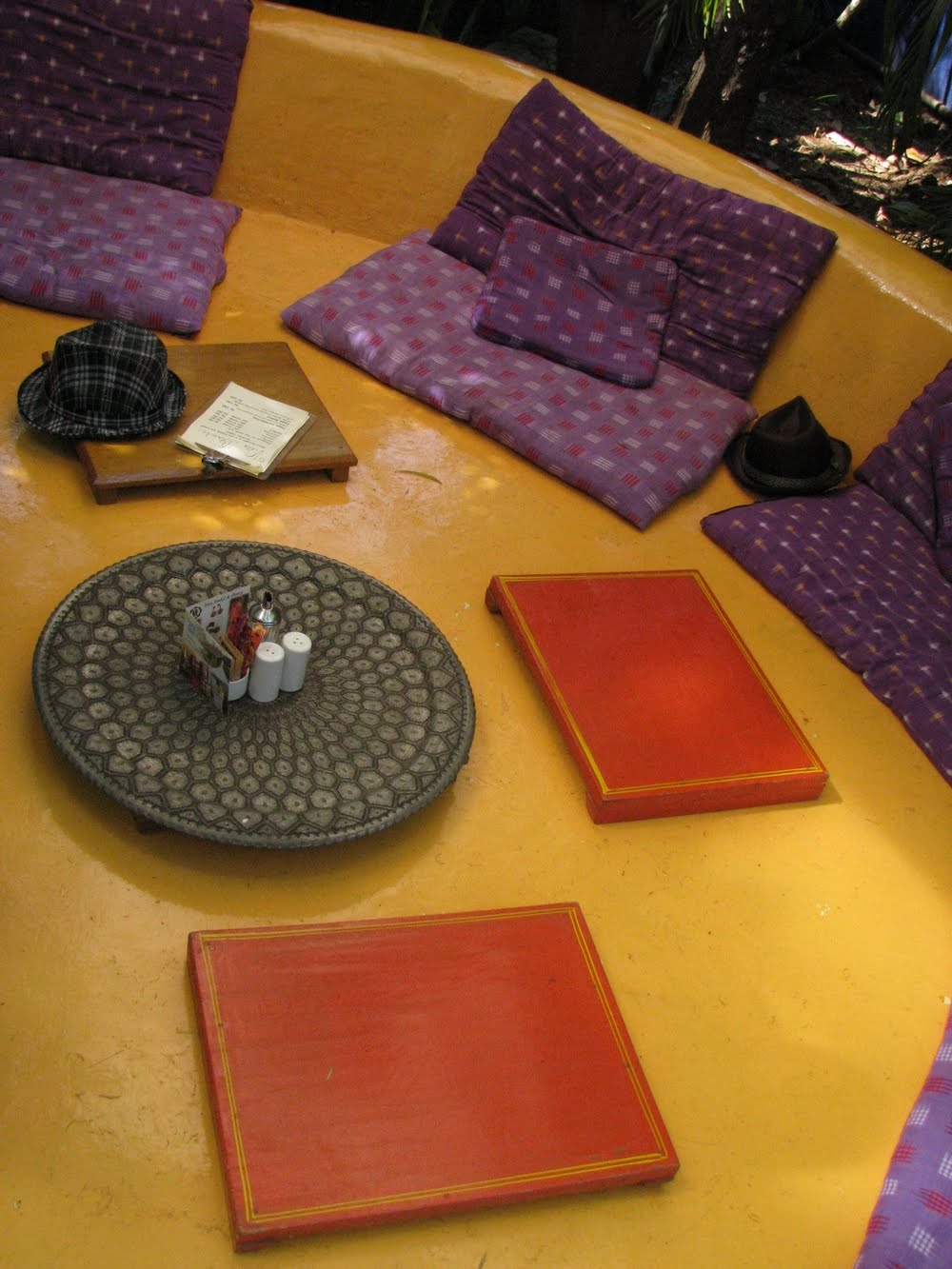 I found the place like a hidden oasis. Bright colours without being gaudy marked the place and its decor. The canopy above looked like some torn parachute and made me wonder whether Villa Blanche really fell out of the sky. There were chairs and tables (topped with tastefully done mosaics) and there were also ground level seating options. We picked the latter since the tables were all occupied. I suppose we were the only Indians there (discounting the cooks and helps in the kitchen). Yogini continued to eye me suspiciously as I walked around shooting tables and hanging trinkets.