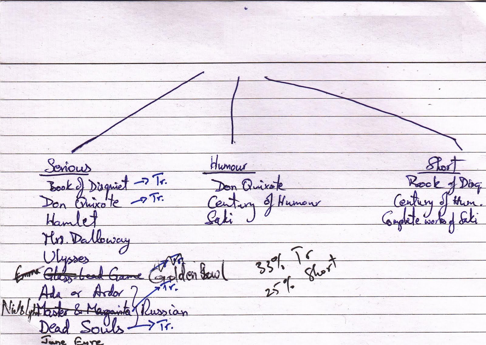 In collating this list I had a few broad criteria. I needed literature representing a good segment of the English speaking world. I was willing to include translations as long as they didn’t exceed 33% of the total list (Book of Disquiet – Portuguese, Don Quixote – Spanish, Dead Souls – Russian and Niels Lyhne – Danish). I also wanted to have shorter works but didn’t want them to exceed 25% of the list (Book of Disquiet, Century of Humour, Complete Works of Saki). I also wanted humour to be an integral part of the list (Don Quixote, Century of Humour, Complete Works of Saki).