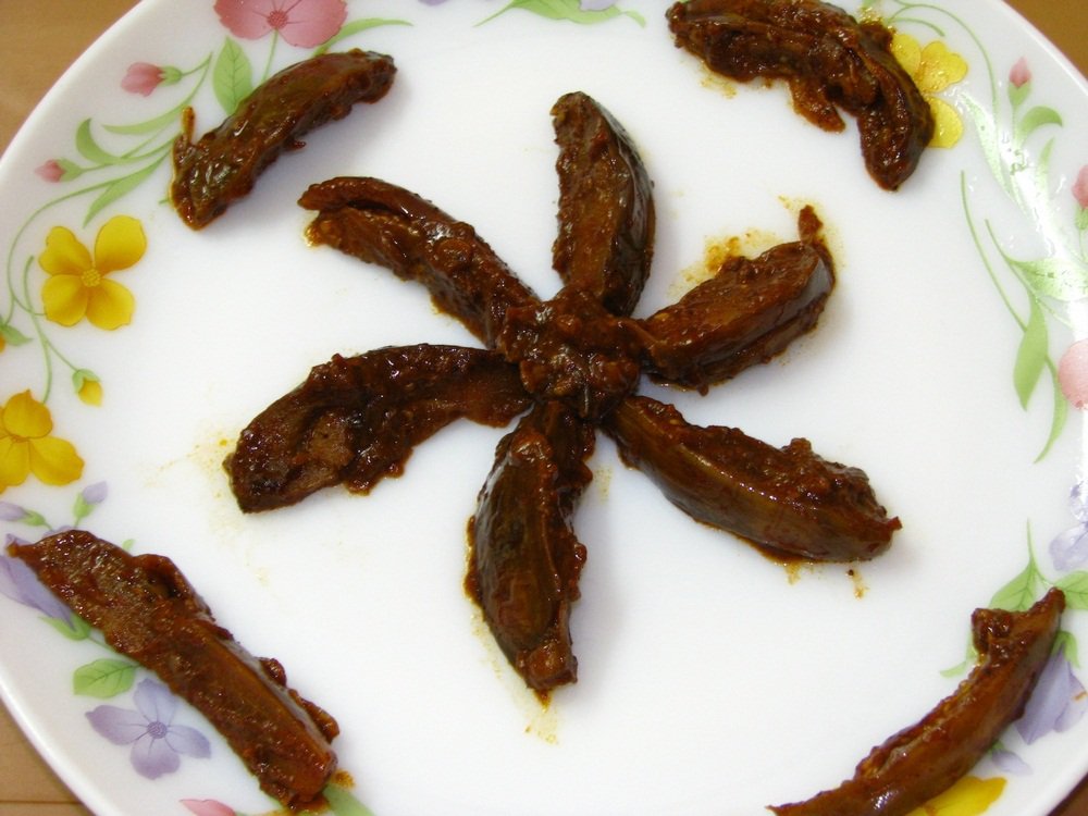 - Tender eggplant/brinjal wedges cooked till near dry in ambotik masala+water added to caramelised onions.